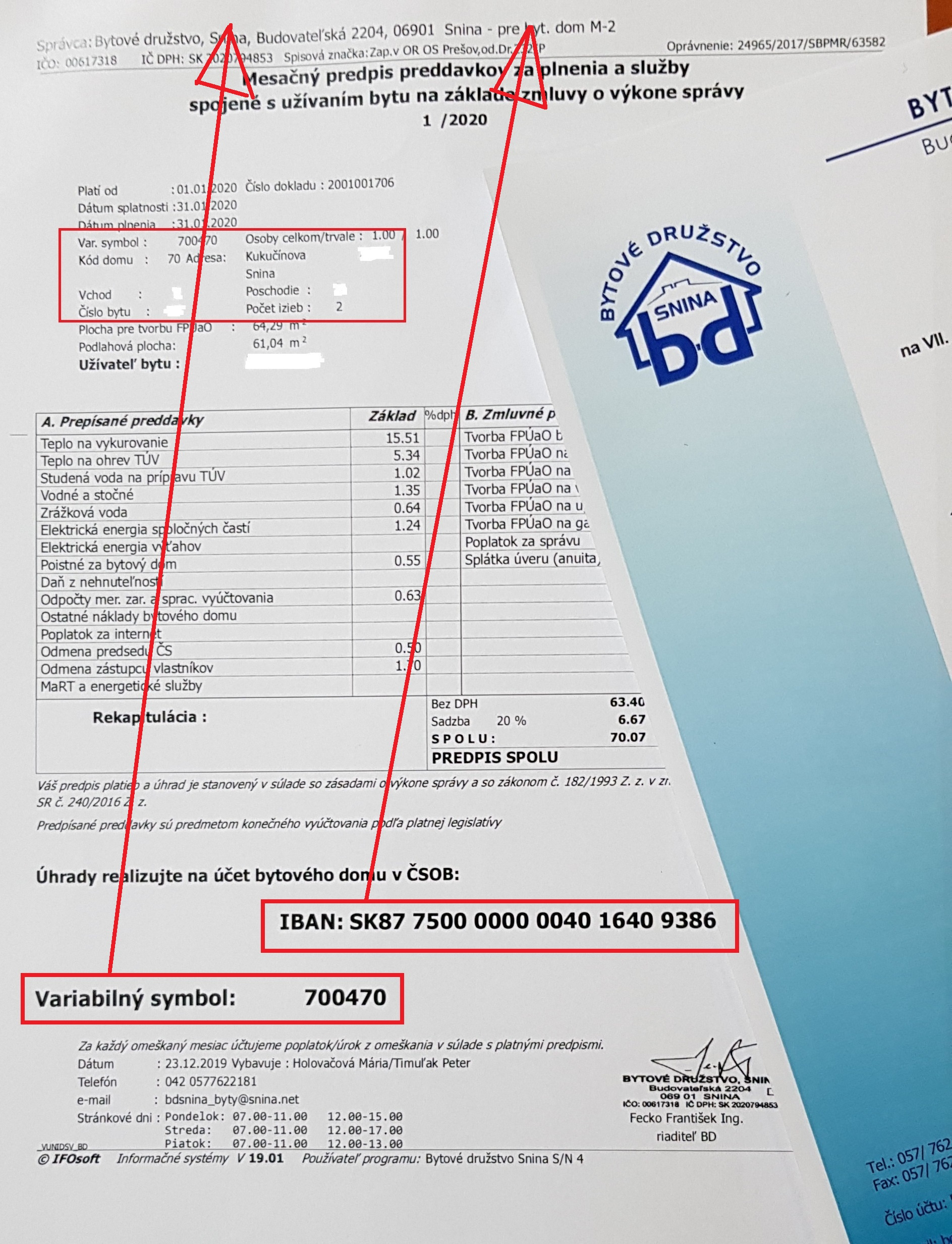 Každy dom má svoj vlastný účet a každý platiteľ má svoj vlastný jedinečný vyriabilný symbol.