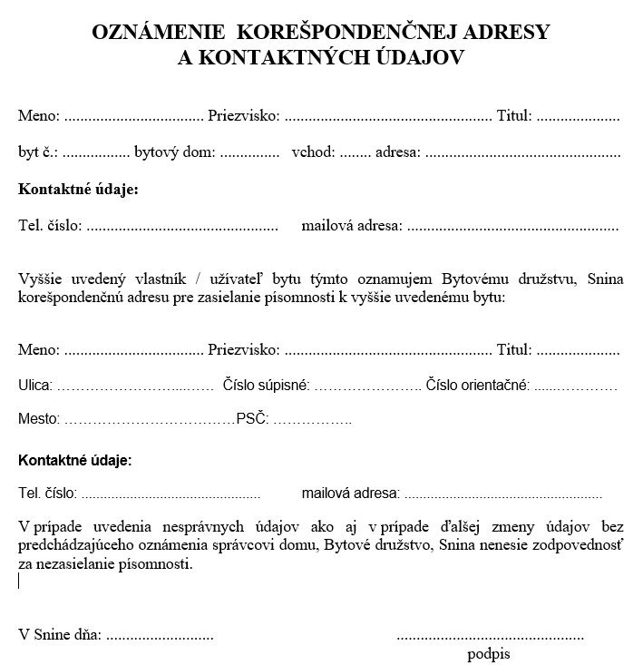 Potrebujete požiadať o zmenu adresy na ktorú Vám budú zasielané všetky doklady týkajúce sa bytu? O zmenu je potrebné požiadať písomne na tomto tlačive: